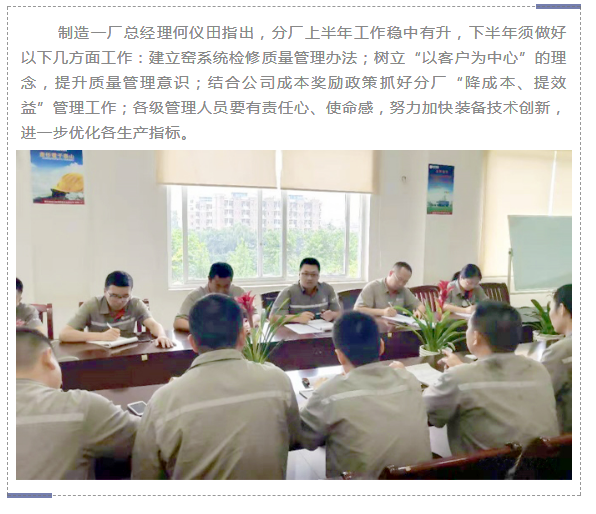 月以来,制造一厂、制造二厂、原料分厂分别组织召开2019年上半年工作总结会,对分厂上半年工作及安全环保情况进行总结,分析了存在的问题和不足,提出改进措施和工作要求,明确了下半年的工作重点。