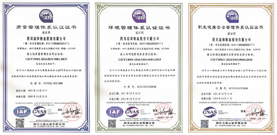 10月22日,峨胜集团旗下四川富和物流股份有限公司顺利取得四川三峡认证有限公司颁发的《质量管理体系认证证书》、《环境管理体系认证证书》、《职业健康安全管理体系认证证书》,公司质量、环境、职业健康安全“三体系”建设取得阶段性成果,管理水平再上台阶。