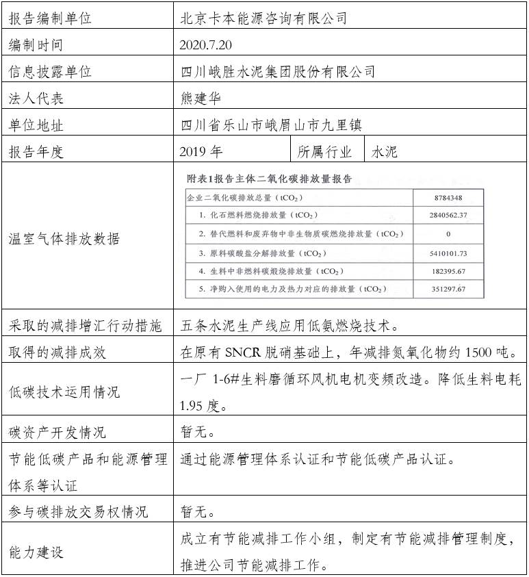 【公告】四川峨胜水泥集团股份有限公司 温室气体排放信息公示(2019)