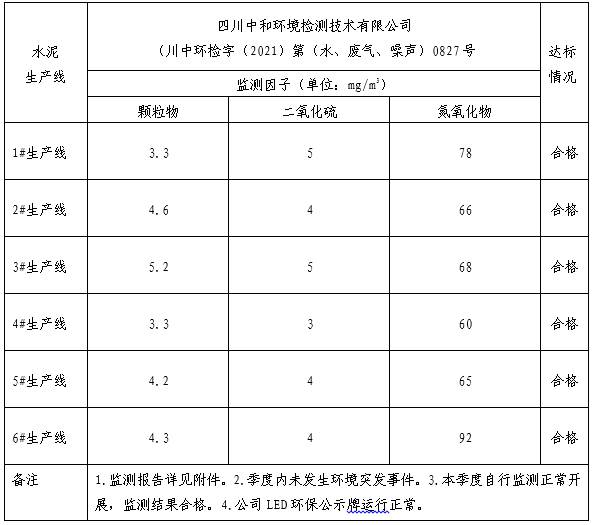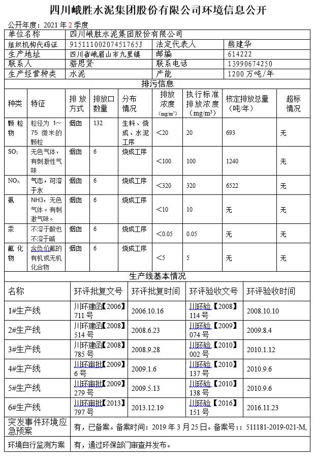【公示】四川峨胜水泥集团股份有限公司 2021年主要污染物排放监测公示表(2季度)