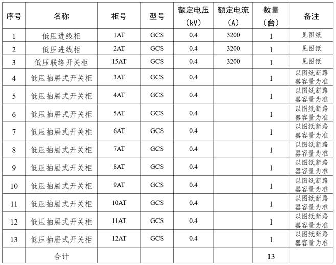 本项目含13台开关柜的供货、拆除和安装,供货为低压开关柜本体及柜内所有电气一次、二次元器件及附件,具体以最终图纸为准。