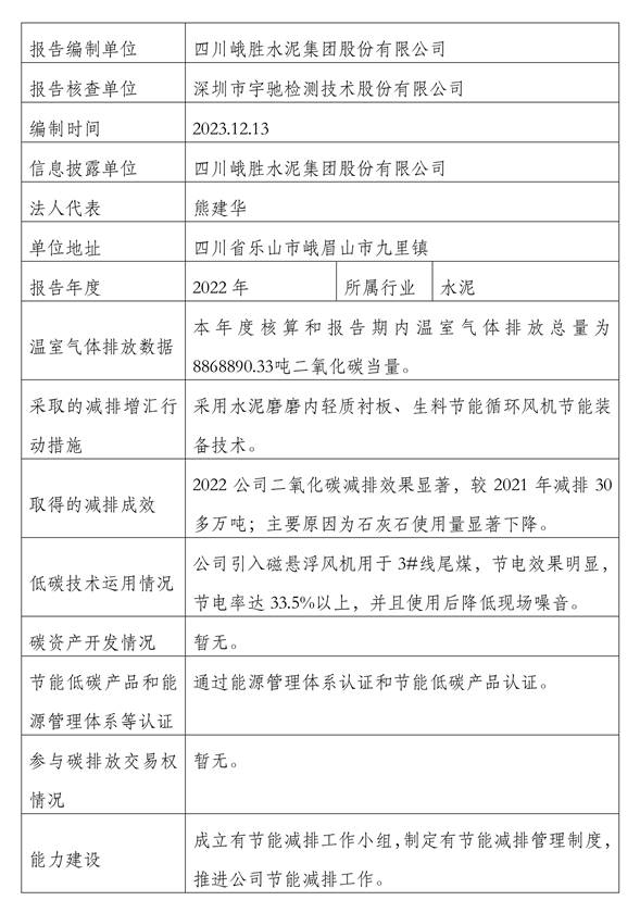 【公示】四川峨胜水泥集团股份有限公司 温室气体排放信息公示(2022)