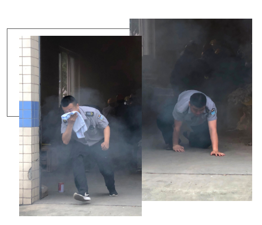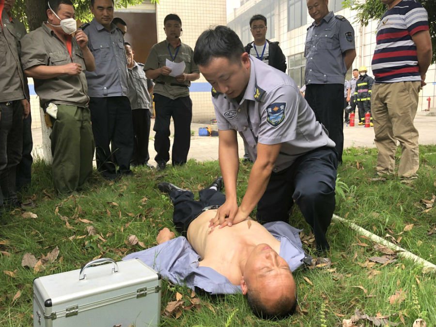 消防站队员首先进行了“初起火灾的扑救”、“火灾事故的应急响应”、“受困人员的搜救”、“应急疏散引导”、“CPR急救”、“现场警戒和管制”、“事故现场恢复及善后处理”7个情景模拟推演,并采用分解方式使观摩人员清晰了解各个环节情况。随后,观摩人员分组进行体验实训,亲自上阵使用灭火器、拼接消火栓、穿戴灭火战斗服、佩戴防毒面具。实训中,专业人员讲解了要领,及时帮助纠正了不规范的程序和操作方法。