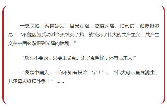 朗文中,李大钊“以青春之我,创建青春之国家”,夏明翰“三封家书”,马本斋“大节不死,母子两代英雄”,杨靖宇“头颅可断腹可剖,烈忾难消志不磨”,陈然“共产党员的狱中诗”,余美群“马前托孤”,江竹筠“竹签子是竹子做的,共产党员的意志是钢铁”,方志敏“可爱的中国”等等,一个个耳熟能详的故事和响亮而坚定的誓言让革命先驱的英勇事迹和革命精神再次浮现到我们的记忆。