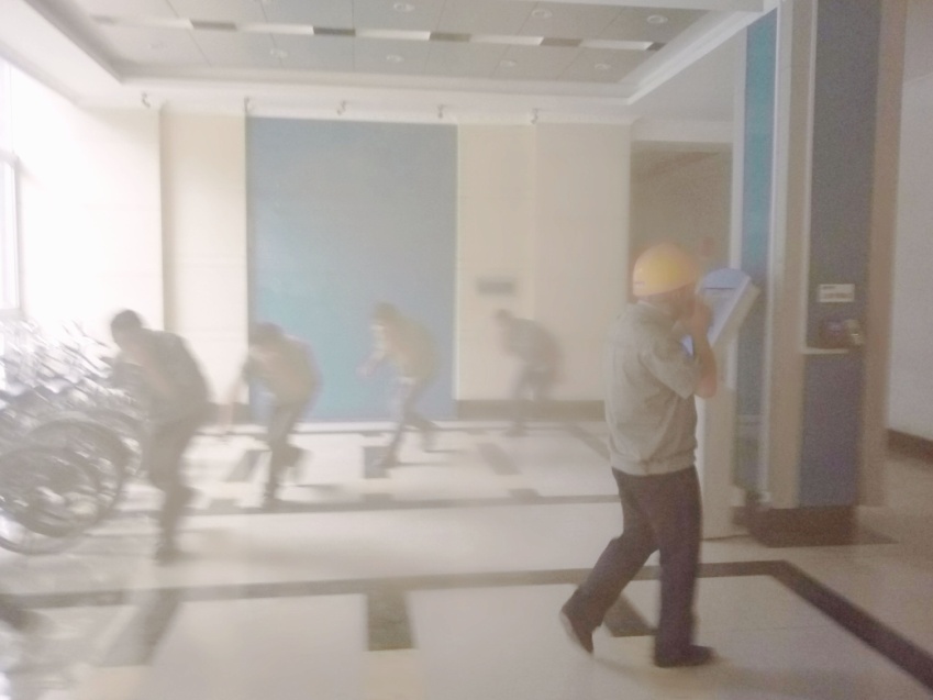 浓烟迅速蔓延到各楼道和办公室,员工们由于经常接受日常安全培训且训练有素,迅速利用周边毛巾、口罩、衣物捂住口鼻,弯腰快步下楼撤离。紧急撤离过程中有一员工摔倒,后续疏散人员见状立即扶起后共同撤离。到达安全地带后,现场指挥小组第一时间组织清点各部门人员确认是否安全。很快,火情得到控制,烟雾进行了通风疏散,收尾工作也按照计划进行。