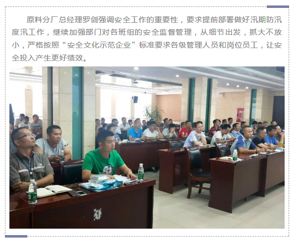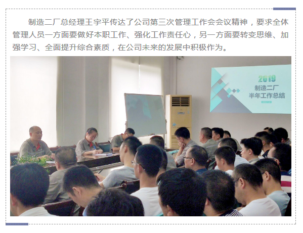 月以来,制造一厂、制造二厂、原料分厂分别组织召开2019年上半年工作总结会,对分厂上半年工作及安全环保情况进行总结,分析了存在的问题和不足,提出改进措施和工作要求,明确了下半年的工作重点。