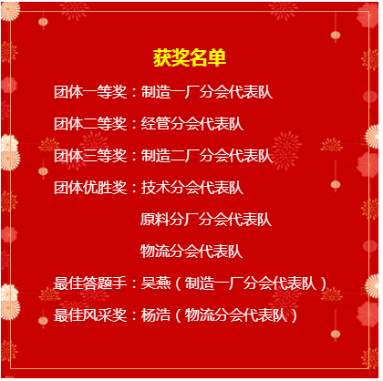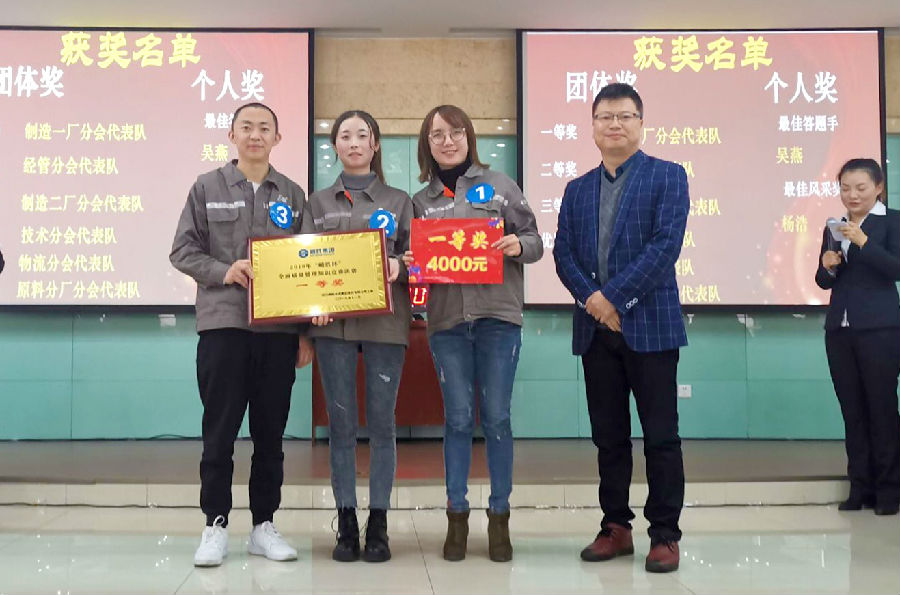 公司副总经理、管理者代表许晓英出席决赛活动并讲话,公司总经理助理、生产发展部总经理晏云华为一等奖代表队颁奖,工会主席邱云川对全面质量管理知识竞赛活动做总结点评。