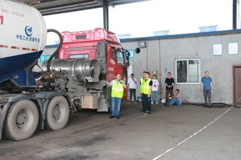 演练模拟水泥运输车辆转弯侧翻,驾驶员被困驾驶室,同行驾驶员现场处置一系列实战流程。