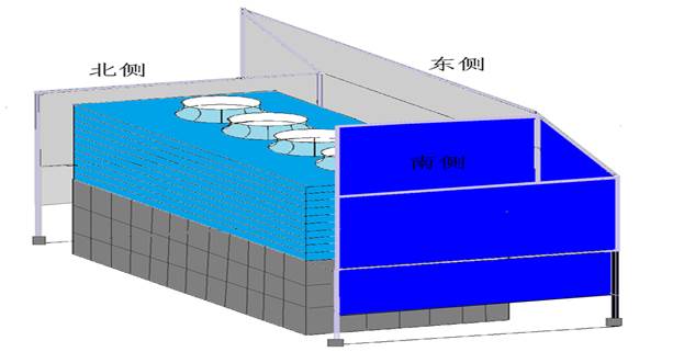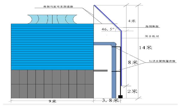 ①满足以下设计方案:在冷却塔东侧、南侧、北侧设置C型隔声屏障(如图1、图2)。其中东侧和南侧竖直屏障高度14m,北侧高度10米,隔声屏障下部2米镂空。东侧屏障顶部制作斜顶至冷却塔边缘,并高出风机出口1.5m,东侧斜顶倾角约46.5°。隔声屏障面积预估:东侧:38.5×(8+5.5)=519.75㎡,北侧:12.8×8+(3.8×4)/2=110㎡,南侧:12.8×8+4×(12.8+9)/2=146㎡,合计:519.75+110+146=775.75㎡。
