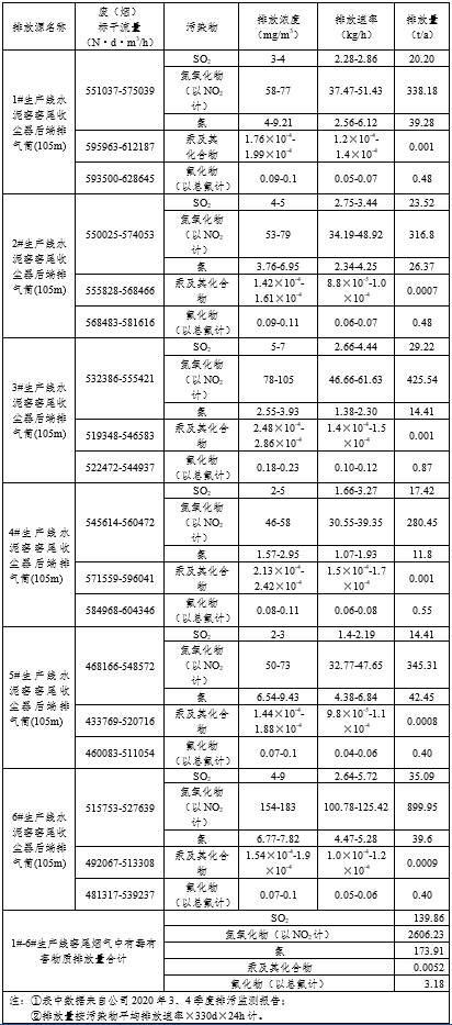 我公司运营期无生产废水外排,生活污水排入九里市政污水处理管网。外排的有毒有害物质主要为6条水泥生产线窑尾废气中二氧化硫、氮氧化物、氨、汞及其化合物、氟化物等,排放情况见下表1。