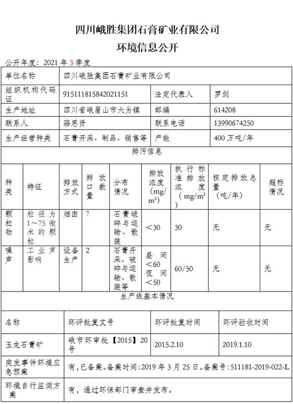 【公告】四川峨胜集团石膏矿业有限公司 2021年主要污染物排放监测公示表(3季度)