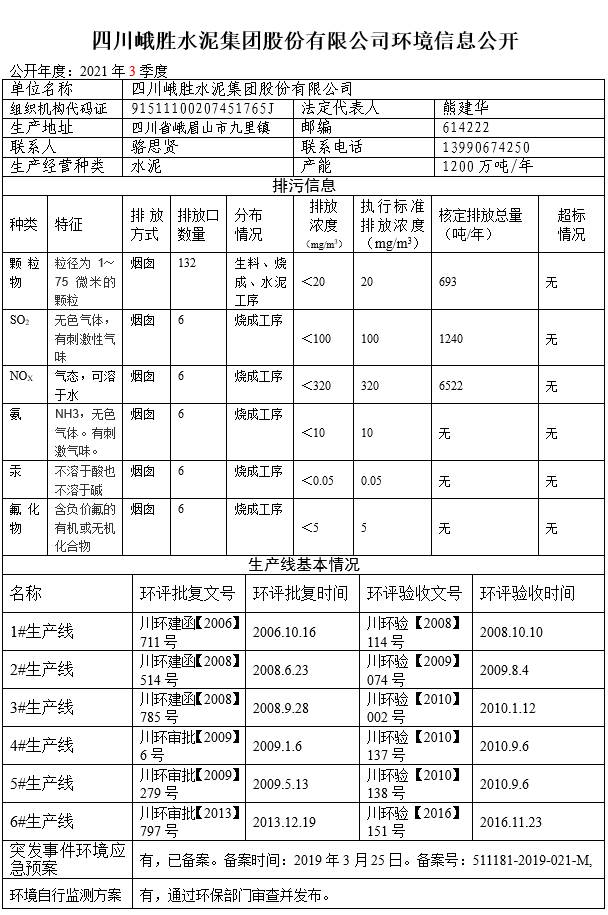 【公告】四川峨胜水泥集团股份有限公司 2021年主要污染物排放监测公示表(3季度)