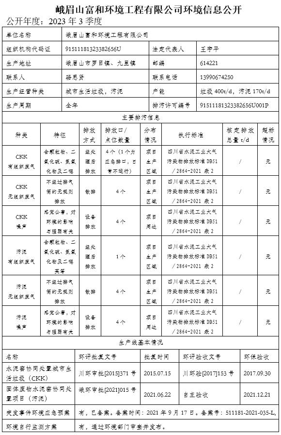 【公示】峨眉山富和环境工程有限公司 2023年环境信息公示(3季度)